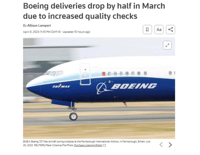 中新網(wǎng)4月10日電 據(jù)路透社報道,波音公司當?shù)貢r間9日公布的一項數(shù)據(jù)顯示,該公司2024年第一季度新機交付數(shù)不足百架。由于監(jiān)管機構(gòu)加強質(zhì)量檢查,波音737 MAX型飛機產(chǎn)量下滑。