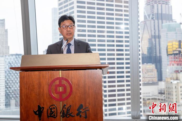 當(dāng)?shù)貢r間4月10日,以“經(jīng)濟合作與文化傳承的雅致之約”為主題的“甘肅雅集”推介活動在美國紐約曼哈頓舉行。圖為甘肅省委常委、副省長張錦剛致辭?! ≈行律缬浾?廖攀 攝