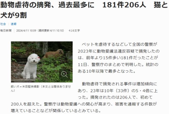 中新網(wǎng)4月11日電 據(jù)日本《每日新聞》報道,11日,日本警察廳發(fā)布消息稱,日本警方在2023年共處理了181起虐待動物的案件,較2022年增加了9%,創(chuàng)下2010年開始統(tǒng)計以來的最高值,累計案件數(shù)量在10年間激增了5倍。