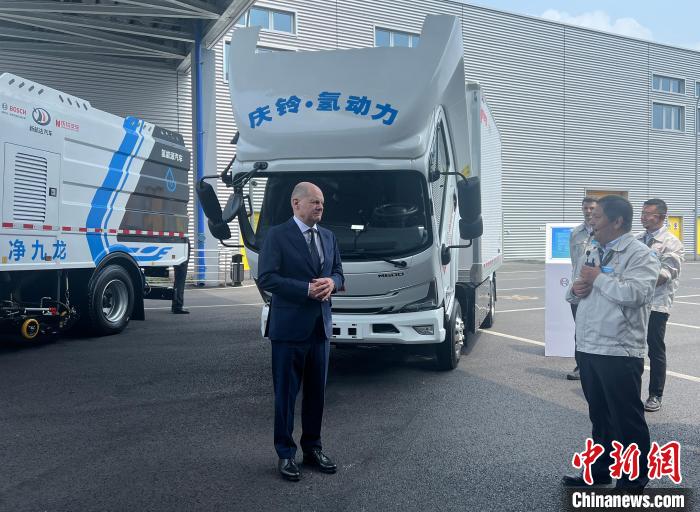 博世氫動(dòng)力系統(tǒng)(重慶)有限公司是朔爾茨訪渝首站參觀地。該公司由博世與慶鈴汽車合資建立,致力于將博世氫燃料電池解決方案引入中國市場(chǎng)。在參訪點(diǎn)入口,四輛冷鏈物流、環(huán)衛(wèi)及牽引車等依次停放。這些車全為中國國產(chǎn)汽車,使用博世氫動(dòng)力系統(tǒng)(重慶)有限公司出產(chǎn)的氫動(dòng)力模塊。朔爾茨在企業(yè)相關(guān)負(fù)責(zé)人的介紹下,了解博世與中企合作的最新成果。在工作人員指引下,朔爾茨為完成預(yù)裝的氫動(dòng)力模塊拴緊最后一顆螺絲,向身邊工作人員豎起了大拇指。