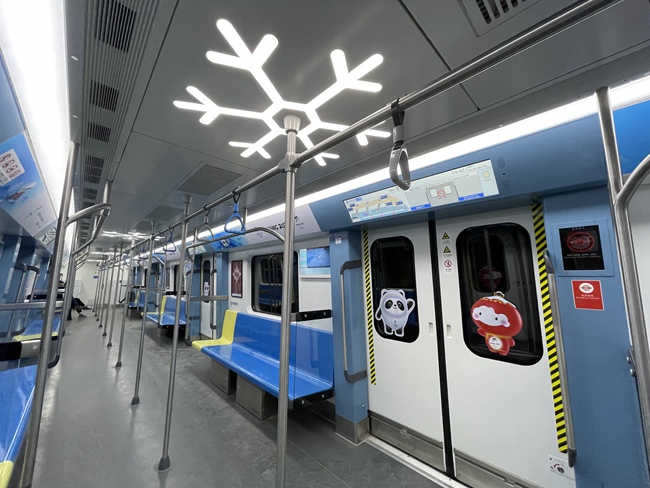 登上車廂,隨處可見冬奧元素。車頂?shù)臒魩Р辉賳握{(diào),而是被設(shè)計(jì)成了雪花的形狀,車廂扶手也融入了冰球桿的設(shè)計(jì)。而在車門上,北京冬奧會(huì)吉祥物“冰墩墩”和“雪容融”仿佛在和乘客們招手。