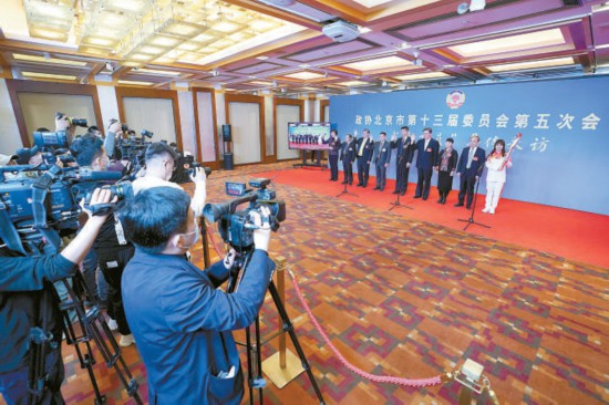 昨天,市政協(xié)十三屆五次會(huì)議舉辦“我是委員”集體采訪(fǎng)。8名委員在現(xiàn)場(chǎng),1名委員通過(guò)視頻圍繞“冬奧有我”“科創(chuàng)中心建設(shè)”“履職為民”三個(gè)主題回答記者提問(wèn)。 本報(bào)記者 方非攝