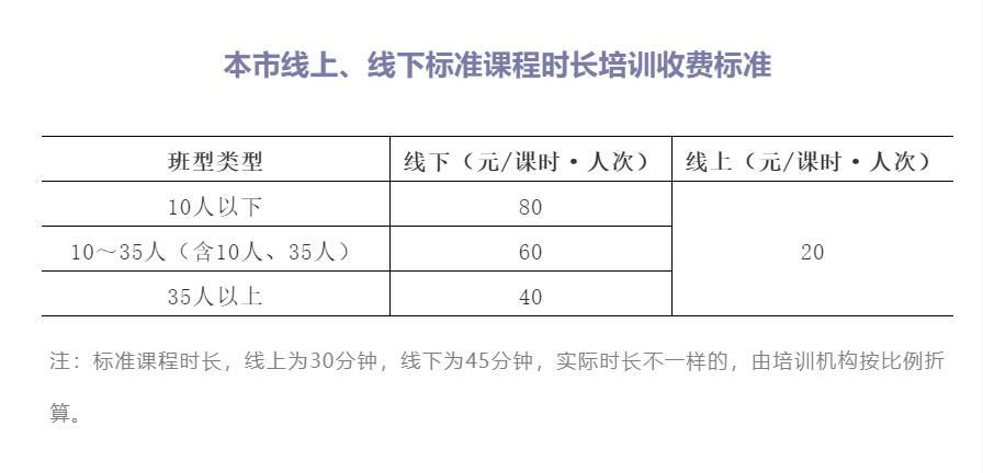 按照國家“要區(qū)分線上和線下以及不同班型,分類制定標(biāo)準(zhǔn)課程時(shí)長的基準(zhǔn)收費(fèi)標(biāo)準(zhǔn)”的要求,根據(jù)國家規(guī)定的主要定價(jià)班型,確定了本市線上、線下學(xué)科類校外培訓(xùn)的基準(zhǔn)收費(fèi)標(biāo)準(zhǔn)和浮動(dòng)幅度。