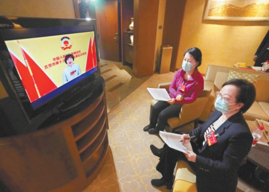 昨天晚上,市政協(xié)十三屆五次會(huì)議視頻播出大會(huì)發(fā)言,委員們?cè)隈v地各房間通過(guò)閉路電視、履職平臺(tái)APP收看。圖為民革界委員李鳳芹(右)和尤揚(yáng)(左)在房間收看委員發(fā)言。本報(bào)記者 方非攝