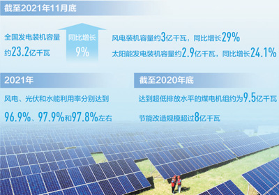 近年來(lái),我國(guó)風(fēng)電、光伏等可再生能源裝機(jī)規(guī)模持續(xù)擴(kuò)大。截至2021年11月底,全國(guó)發(fā)電裝機(jī)容量約23.2億千瓦,同比增長(zhǎng)9%。其中,風(fēng)電裝機(jī)容量約3億千瓦,同比增長(zhǎng)29%;太陽(yáng)能發(fā)電裝機(jī)容量約2.9億千瓦,同比增長(zhǎng)24.1%。