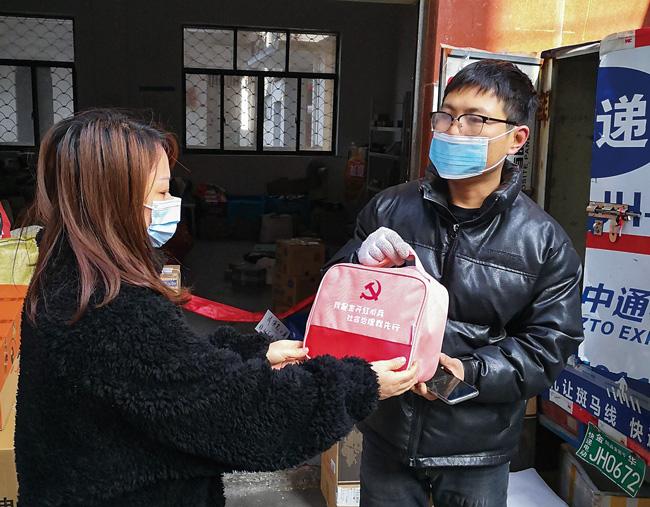 1月12日,金華開發(fā)區(qū)江南街道金錢寺社區(qū)給快遞小哥贈(zèng)送裝有口罩、酒精、消毒液等物資的“防疫禮包”,讓快遞小哥做好自身防護(hù)。(時(shí)寬兵)