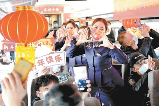 1月16日,合肥客運段工作人員在G7162次列車上為旅客表演節(jié)目,讓旅途充滿溫情。2022年春運從1月17日開始,2月25日結束,共計40天。 新華社記者 黃博涵攝