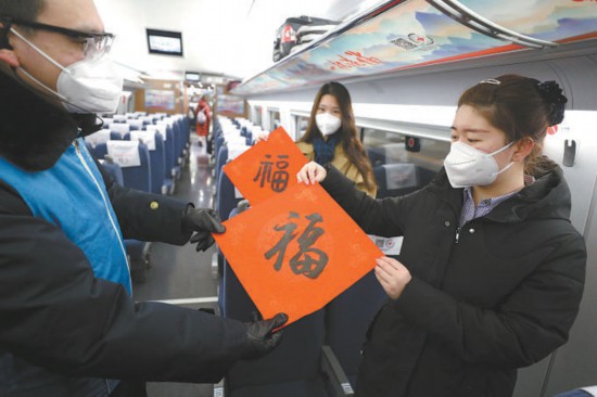 “乘務組夜里3點半起床,比平時更早抵達站臺。列車一進站,大伙兒就忙著布置車廂,希望旅客的回家路更溫馨?!绷熊囬L靳艷清說,冬奧會即將開幕,恰逢中國人最重要的節(jié)日春節(jié),她希望能跟旅客一同寫下新年祝福,為國家加油、為自己加油。