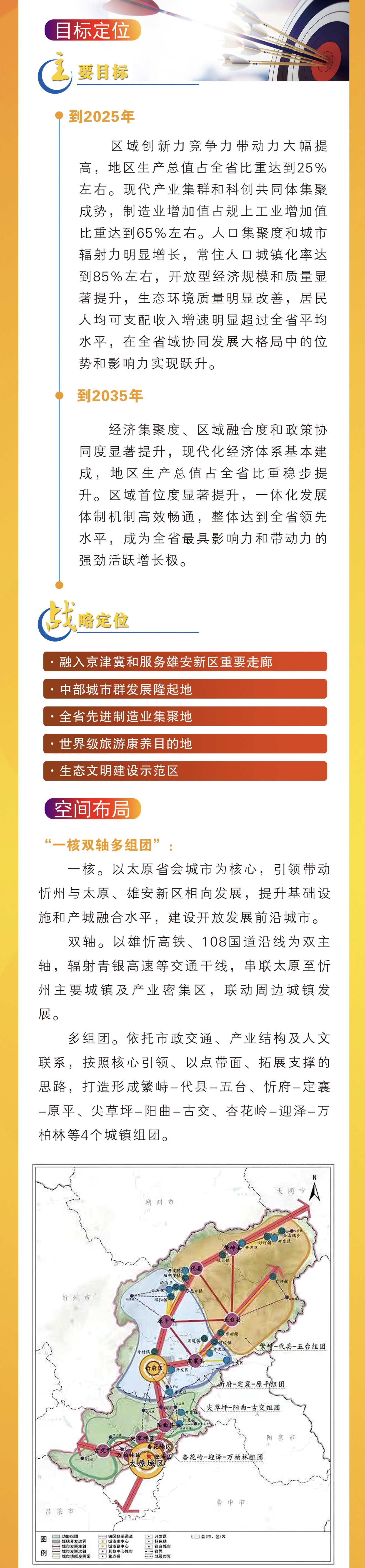 《指導(dǎo)意見(jiàn)》謀劃確定了太忻一體化經(jīng)濟(jì)區(qū)的實(shí)施范圍,提出了融入京津冀和服務(wù)雄安新區(qū)重要走廊、中部城市群發(fā)展隆起地、全省先進(jìn)制造業(yè)集聚地、世界級(jí)旅游康養(yǎng)目的地、生態(tài)文明建設(shè)示范區(qū)等五大戰(zhàn)略定位和“一軸雙核多組團(tuán)”的空間布局,分2025年、2035年兩個(gè)時(shí)間節(jié)點(diǎn)明確了發(fā)展目標(biāo),部署了六個(gè)方面的重點(diǎn)任務(wù)。