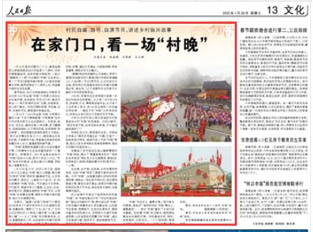 1月25日至26日,農(nóng)歷小年之際,國(guó)家公共文化云推出“村晚”接力云展播,集中展示《我的“村晚”我的年》融媒體節(jié)目,以及來(lái)自內(nèi)蒙古、黑龍江、上海等20個(gè)省(區(qū)、市)的30場(chǎng)精彩“村晚”活動(dòng)。節(jié)目通過(guò)文化傳承、時(shí)代新風(fēng)、展望未來(lái)3個(gè)篇章,以訪談、互動(dòng)、游戲等方式,展播各地特色“村晚”節(jié)目、分享“村晚”臺(tái)前幕后故事、展現(xiàn)鄉(xiāng)村振興美好畫卷、推介鄉(xiāng)村美景好物。