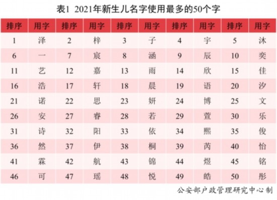 報告顯示,2021年出生并已經(jīng)進(jìn)行戶籍登記的新生兒名字中,使用頻率最高的50個字依次為澤、梓、子、宇、沐等。