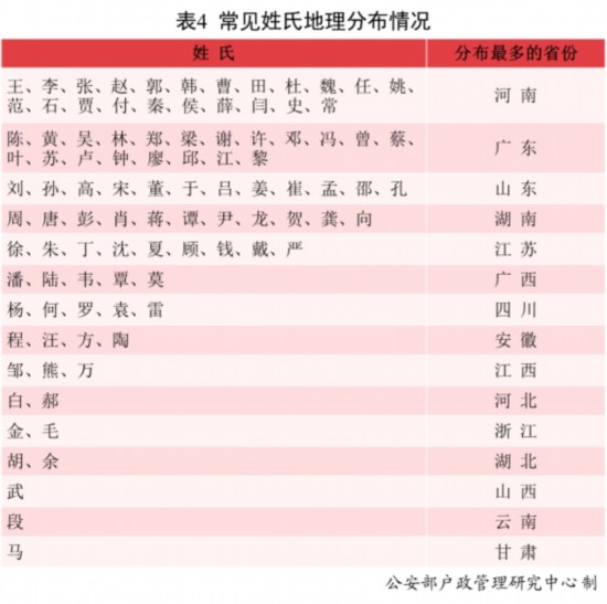 王、李、張等二十二個姓氏人口分布最多的省份是河南;劉、孫、高等十二個姓氏人口分布最多的省份是山東;徐、朱、丁等九個姓氏人口分布最多的省份是江蘇;潘、陸、韋等五個姓氏人口分布最多的省份是廣西;程、汪、方等四個姓氏人口分布最多的省份是安徽;鄒、熊、萬三個姓氏人口分布最多的省份是江西……