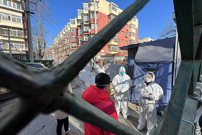 1月25日早8點(diǎn),室外氣溫低于零度,而今日的大風(fēng)天氣更降低了體感溫度。在小區(qū)門(mén)口,街道和社區(qū)的“大白”們?cè)缫丫臀?,在管控區(qū)外值守并隨時(shí)準(zhǔn)備為身體不便的居民進(jìn)行入戶核酸檢測(cè)工作。
