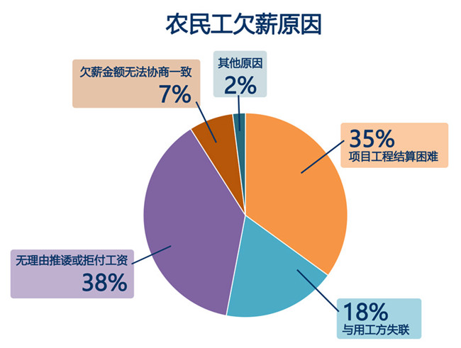 在群眾留言中,農(nóng)民工欠薪的情況大部分為薪資未全額支付,這類占留言總數(shù)的約82%;無勞動合同、反復(fù)追討無果以及拖欠生活費的情況也有發(fā)生。項目工程結(jié)算困難、用工方推諉則是導(dǎo)致欠薪的主要原因。