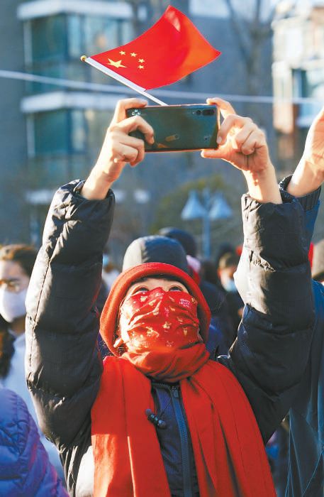 昨天,“重啟”的百旺茉莉園一期充滿了新年的喜慶,在小區(qū)南門廣場處,孩子們和居民們一起高唱《歌唱祖國》《明天會更好》,表達感激和喜悅之情。本報記者 王海欣攝