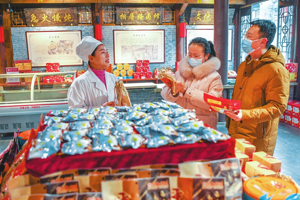 1月28日,游客在平遙古城一商店內購買年貨?;⒛甏汗?jié)將至,平遙古城內花燈高掛,特色產品商店貨物充足,洋溢著濃濃的年味。(梁生仁攝)