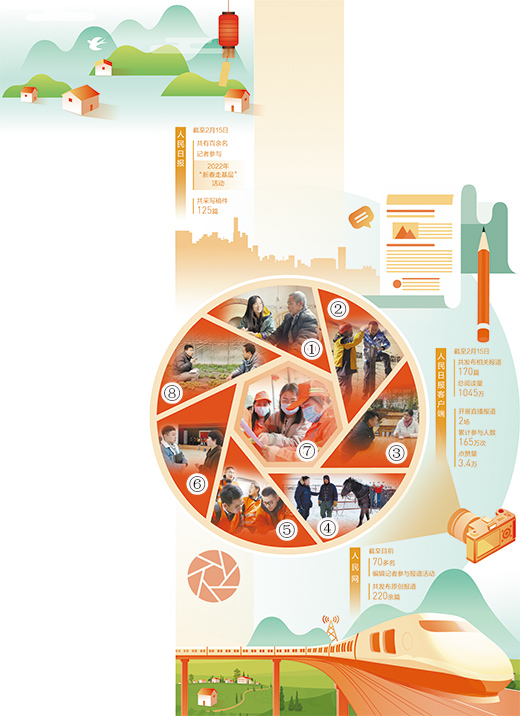 圖①至圖⑧依次為本報(bào)重慶分社記者常碧羅(左)、青海分社記者賈豐豐(右)、湖南分社記者王云娜(右)、內(nèi)蒙古分社記者吳勇(左)、福建分社記者劉曉宇(左)、浙江分社記者竇瀚洋(左)、廣西分社記者祝佳祺(中)及人民網(wǎng)記者馮亞濤(左)在春節(jié)期間深入基層采訪。