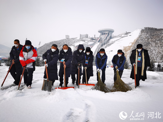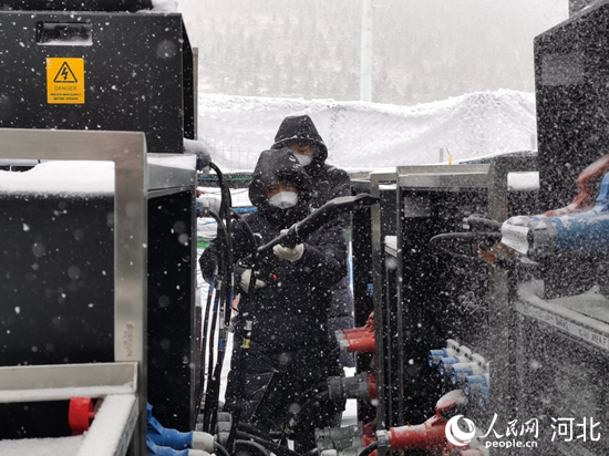 國(guó)家冬季兩項(xiàng)電力保障團(tuán)隊(duì)在暴雪中清理積雪,確保設(shè)備健康。 馬錚攝