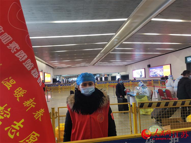 在蘇州火車站參與志愿服務(wù)的熱心市民何群飛。人民網(wǎng)記者 王繼亮攝