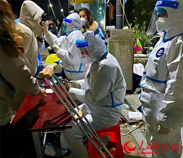 從16日晚上開始,蘇州市第九人民醫(yī)院醫(yī)生白志余拄著拐杖的照片在朋友圈刷屏?!罢埓蠹遗抨爼r務(wù)必戴好口罩、保持防護(hù)距離、提前展示健康碼、降低感染風(fēng)險......”他連夜加入核酸檢測志愿者隊伍中,拄著雙拐維持秩序,被居民們親切地稱為“拐杖醫(yī)生”。