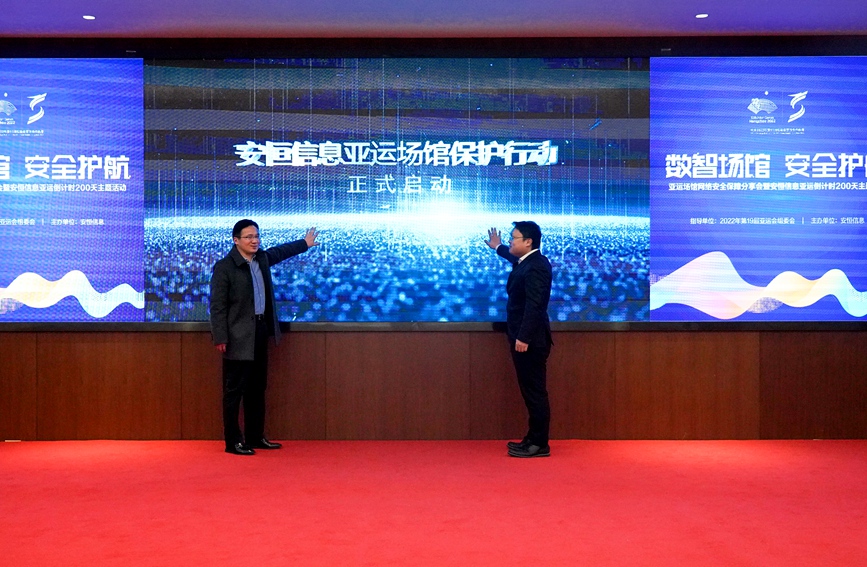 人民網(wǎng)杭州2月23日電 (張麗瑋)今天,杭州亞組委廣播電視和信息技術(shù)部副部長趙欣浩與安恒信息高級(jí)副總裁袁明坤共同啟動(dòng)了“亞運(yùn)場(chǎng)館網(wǎng)絡(luò)安全保護(hù)行動(dòng)”。