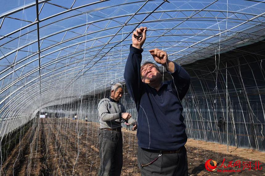 永清縣相輝果蔬農(nóng)民專業(yè)合作社,員工為西瓜種植綁吊秧繩。劉欣羽攝