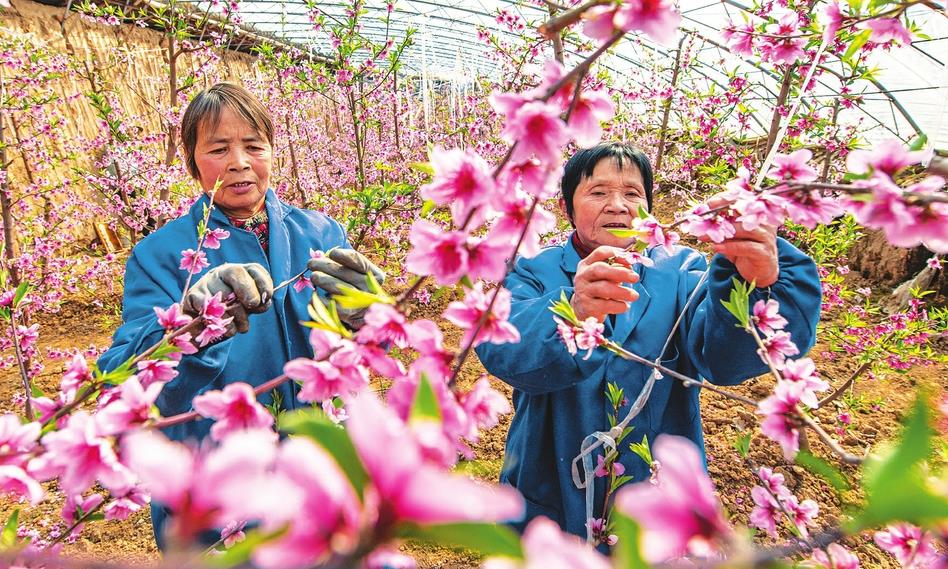 2月24日,夏縣南大里鄉(xiāng)南北晉村郭老蔬菜種植專業(yè)合作社社員在大棚內(nèi)給油桃疏花。該社根據(jù)本村地理氣候特點(diǎn),從山東引進(jìn)新品種,搭建11個(gè)大棚發(fā)展新品種油桃。該油桃成熟早、酸甜可口,遠(yuǎn)銷四川、河北等地,畝收入達(dá)2萬多元。(薛俊攝)