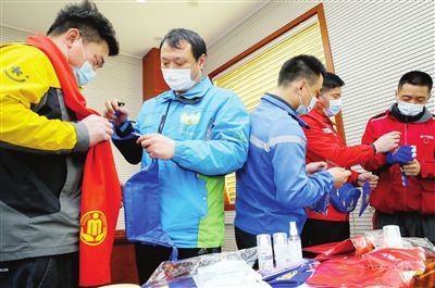 圖為快遞小哥代表領取“暖心包裹”。 記者 吳迪 攝