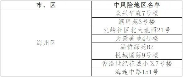 通告稱,根據(jù)國務院聯(lián)防聯(lián)控機制有關規(guī)定,經(jīng)綜合評估研判,市指揮部決定,自2022年3月6日0時起,將眾興華庭7號樓、潤琦苑3號樓、九嶺社區(qū)北大荒西21號、天景美地4號樓、溫僑綠苑B2、悅城國際9號樓、香溢世紀花城小區(qū)7號樓、海連中路151號調整為中風險地區(qū),其他地區(qū)風險等級不變。
