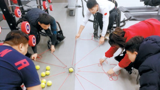 徐守森(右一)帶領(lǐng)輪椅冰壺運(yùn)動員通過互動游戲緩解比賽壓力。