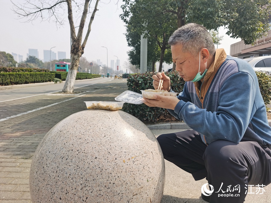3月2日,忙完志愿服務工作后,王新買了一份快餐。由于禁止堂食,他蹲在路邊吃了起來。人民網(wǎng)記者 王繼亮攝