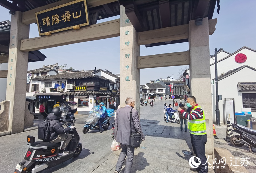 3月7日,在蘇州姑蘇區(qū)山塘街,王新(右)提醒一名老人戴口罩。人民網(wǎng)記者 王繼亮攝