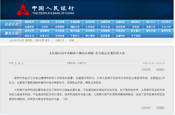 央行上繳萬(wàn)億元結(jié)存利潤(rùn) 專(zhuān)家:增大轉(zhuǎn)移支付惠企利民