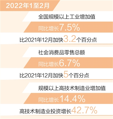 工業(yè)、服務(wù)業(yè)逐步回升。1至2月,全國規(guī)模以上工業(yè)增加值同比增長7.5%,比2021年12月加快3.2個百分點,41個大類行業(yè)中超過九成行業(yè)實現(xiàn)增長;全國服務(wù)業(yè)生產(chǎn)指數(shù)同比增長4.2%,比2021年12月加快1.2個百分點。