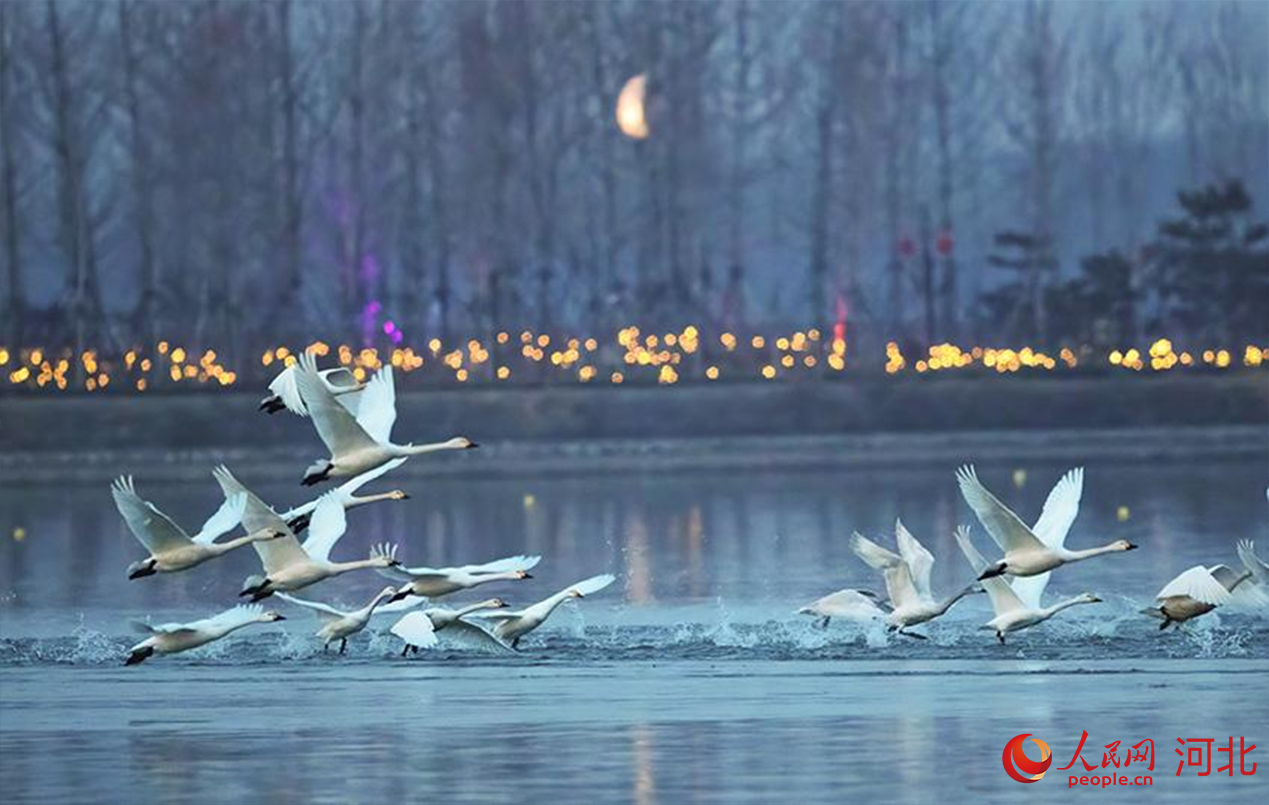 河北省石家莊市滹沱河葉子廣場東側的水面上,數(shù)百只白色的精靈小天鵝在這里嬉戲。 劉洵攝