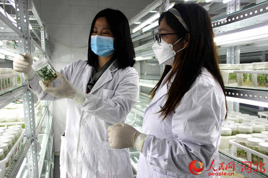 定州市綠谷農(nóng)業(yè)科技發(fā)展有限公司工作人員在無菌培養(yǎng)室察看新型育苗的長勢情況。 周永攝