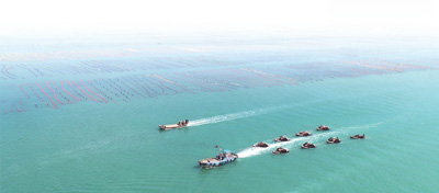 在山東省榮成市愛倫灣海域,養(yǎng)殖工人駕駛滿載江蘺的舢板駛向碼頭。