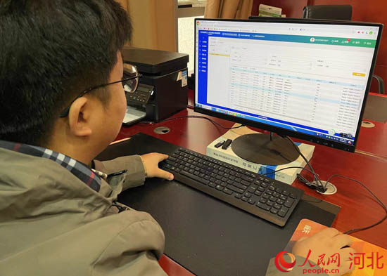 工作人員通過河北省建筑工人實(shí)名制和分賬制管理公共服務(wù)平臺(tái)監(jiān)測(cè)某項(xiàng)目農(nóng)民工考勤記錄。 人民網(wǎng) 林福盛攝