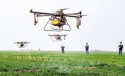 3月19日,石家莊市溫德格信農業(yè)科技有限公司工作人員在石家莊市欒城區(qū)南高鄉(xiāng)魯家莊村麥田里使用無人植保機作業(yè)。河北日報通訊員 李明發(fā)攝