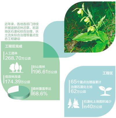 近年來,各地各部門持續(xù)開展退耕還林還草、巖溶地區(qū)石漠化綜合治理、水土流失綜合治理等重點生態(tài)工程建設(shè)。據(jù)統(tǒng)計,工程區(qū)完成人工造林268.70萬公頃、封山育林196.61萬公頃、低效林改造174.39萬公頃,森林覆蓋率達(dá)68.6%;工程區(qū)65個重點治理縣累計治理石漠化土地62萬公頃,石漠化土地面積減少約40萬公頃。