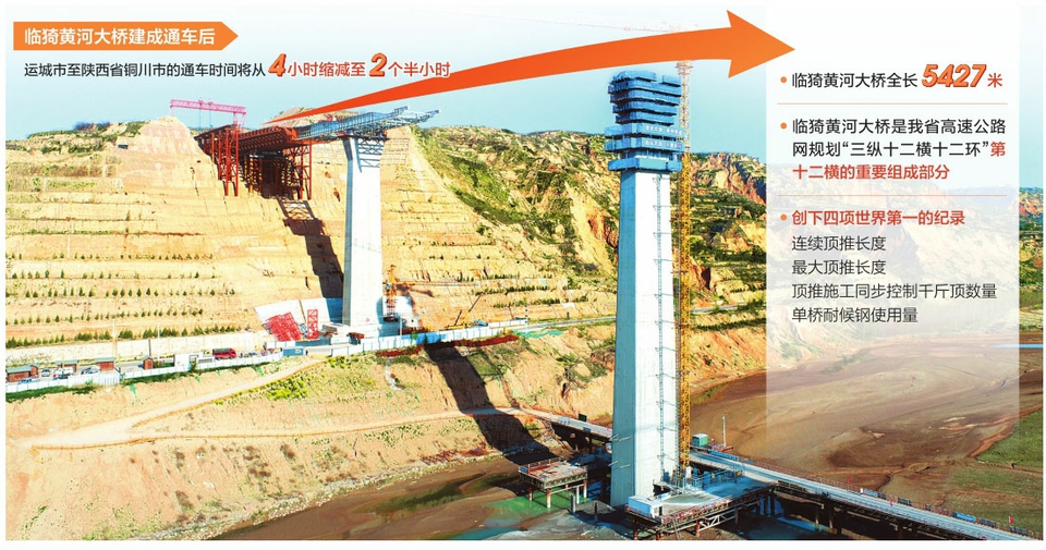 臨猗黃河大橋是連接晉陜最長(zhǎng)的黃河公路大橋,全長(zhǎng)5427米,主橋采用等高度連續(xù)鋼箱組合梁,從山西、陜西兩處頂推平臺(tái)對(duì)向頂推,這也創(chuàng)下連續(xù)頂推長(zhǎng)度、最大頂推長(zhǎng)度、頂推施工同步控制千斤頂數(shù)量以及單橋耐候鋼使用量四項(xiàng)世界第一的紀(jì)錄。