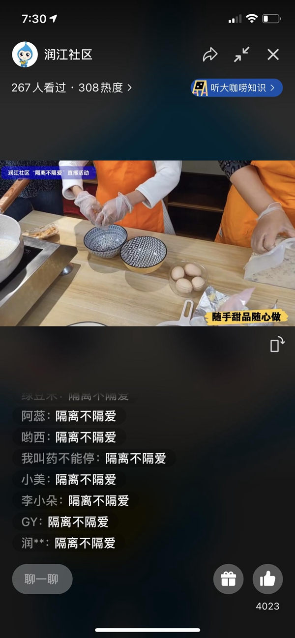 在這個特殊的“戰(zhàn)疫”時刻,潤江社區(qū)依舊在3月29日-4月3日6天時間里陸續(xù)推出了包括心理疏導(dǎo)課程、健身指導(dǎo)課程、烘焙分享、家庭收納、親子共讀和感悟分享在內(nèi)的直播內(nèi)容。截至目前,“小杜直播間”已經(jīng)吸引了社區(qū)內(nèi)近1500人次觀看,這些直播內(nèi)容貼合了社區(qū)居民的需求,從各方面為居民緩解居家的焦慮、豐富居民的居家生活。