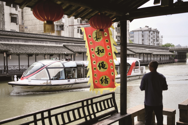 4月10日下午,嘉興市區(qū)環(huán)城河水面上,一艘水上巴士駛過。當天,嘉興市區(qū)公交、水上巴士等逐步恢復營運。(王振宇)