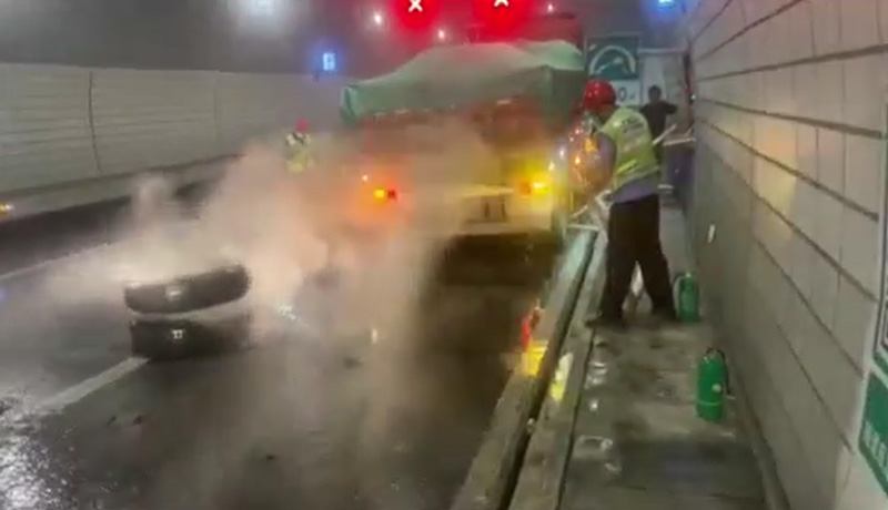 22點(diǎn)3分,巡查員通過(guò)對(duì)向隧道的汽通門第一時(shí)間進(jìn)入現(xiàn)場(chǎng),施救人員從同向到達(dá)現(xiàn)場(chǎng),一次“雙向奔赴”的救火就此展開(kāi)。一名巡查員與施救人員緊密配合,拿出水槍,對(duì)著起火點(diǎn)進(jìn)行滅火。不出2分鐘,起火點(diǎn)的明火被熄滅,但是溫度還是很高,需要不斷澆水才能阻止輪胎復(fù)燃。另一名巡查員則將司機(jī)帶離到安全地帶,隨后又將車道上的雜物清理至緊急停車帶,以便解除卡口后為后續(xù)車輛提供一個(gè)安全的行車環(huán)境。22點(diǎn)23分,車道恢復(fù)暢通。
