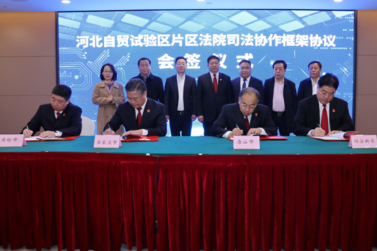 河北自貿(mào)試驗(yàn)區(qū)片區(qū)法院司法協(xié)作框架協(xié)議會(huì)簽儀式現(xiàn)場(chǎng)。 張亞寧攝