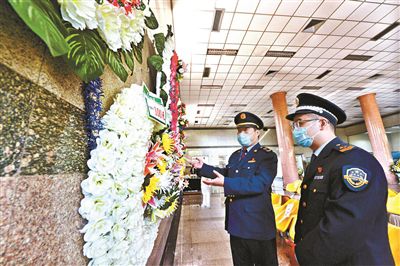隨后,執(zhí)法人員又來到通州區(qū)殯儀館進(jìn)行檢查。進(jìn)入殯儀館的業(yè)務(wù)大廳,左側(cè)的墻上懸掛著大大小小的花圈,每一個花圈旁都附有一個醒目的商品價(jià)簽,價(jià)格從100元到300元不等,商品名稱為“租花圈”。在正前方空地上擺放的鮮花花籃上,也都附有待租的名牌及價(jià)簽。