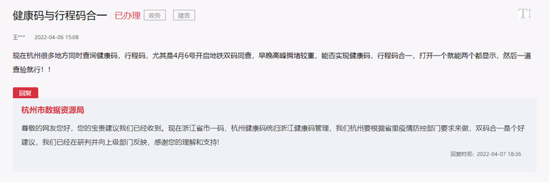 急難愁盼|網(wǎng)友建言健康碼行程碼等“多碼合一” 杭州:正在探索