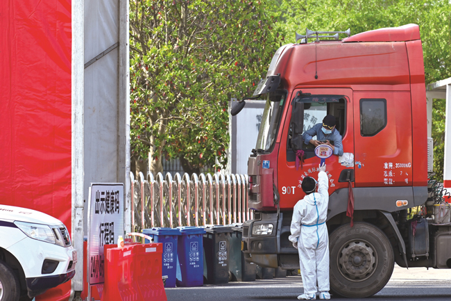 4月21日,在嘉興市嘉善縣天凝高速出入口,交警正在核驗(yàn)過(guò)往司乘人員的健康碼、行程卡、核酸檢測(cè)報(bào)告和有無(wú)途經(jīng)中高風(fēng)險(xiǎn)地區(qū)等信息,筑牢疫情防線(xiàn),保障物流安全暢通。(張啟帆)