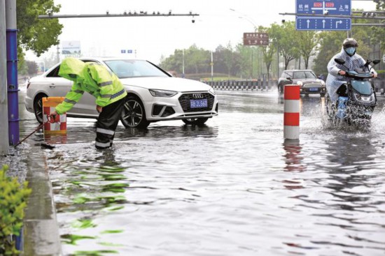 4月26日,在嘉興市區(qū)中山西路,因短時(shí)暴雨造成部分路段臨時(shí)積水,來自周邊企業(yè)的志愿者堅(jiān)守在大雨中清除路面積水,保障過往車輛及行人的交通安全。(馮玉坤)