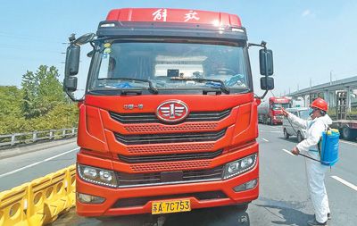 4月21日,郭輝駕駛貨車返回南京后,防疫工作人員對(duì)貨車進(jìn)行消毒。本報(bào)記者 姚雪青攝